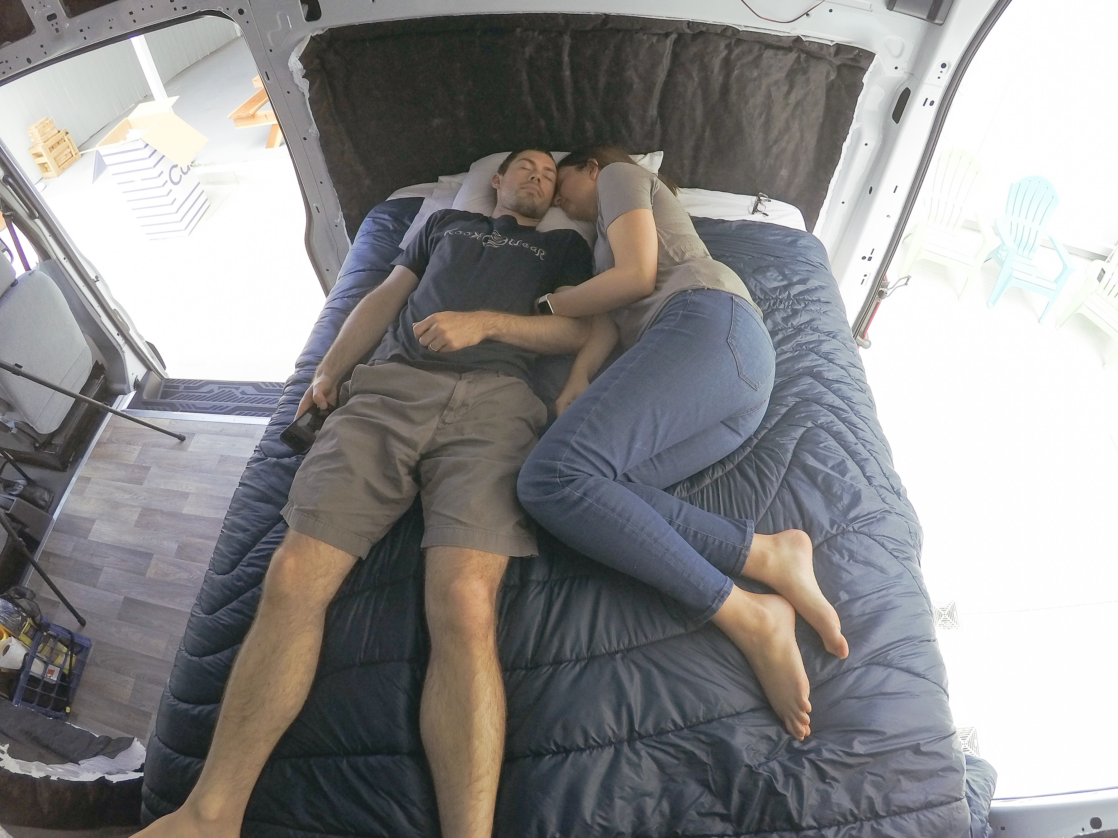 Installing the bed width wise saves us almost 2 feet of space in the galley and living room. But it’s a tight squeeze between the 2 walls of the van and doesn’t allow any room to hang a foot or hand off the mattress. We plan on doing a few test nights to make sure that we can sleep this way.