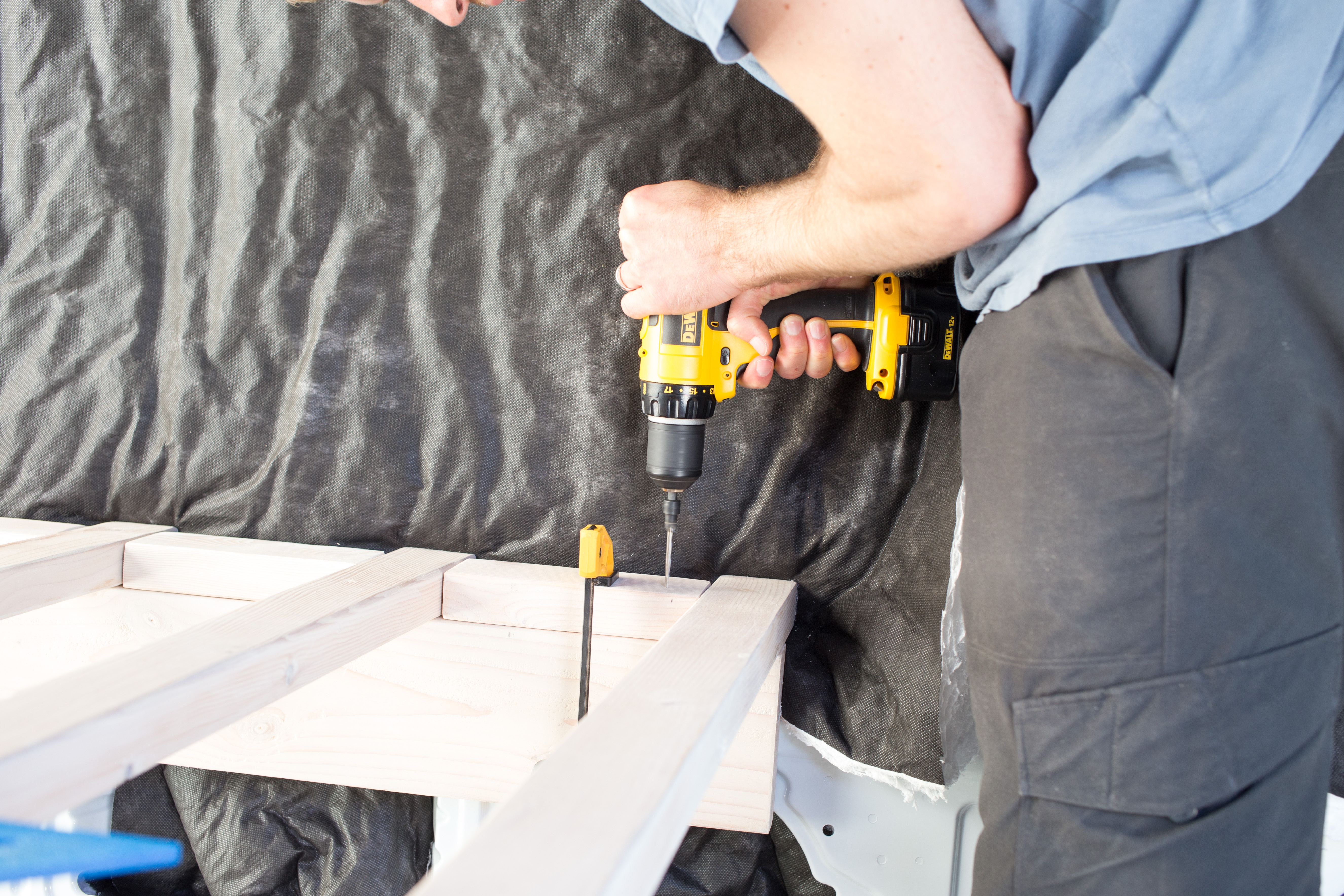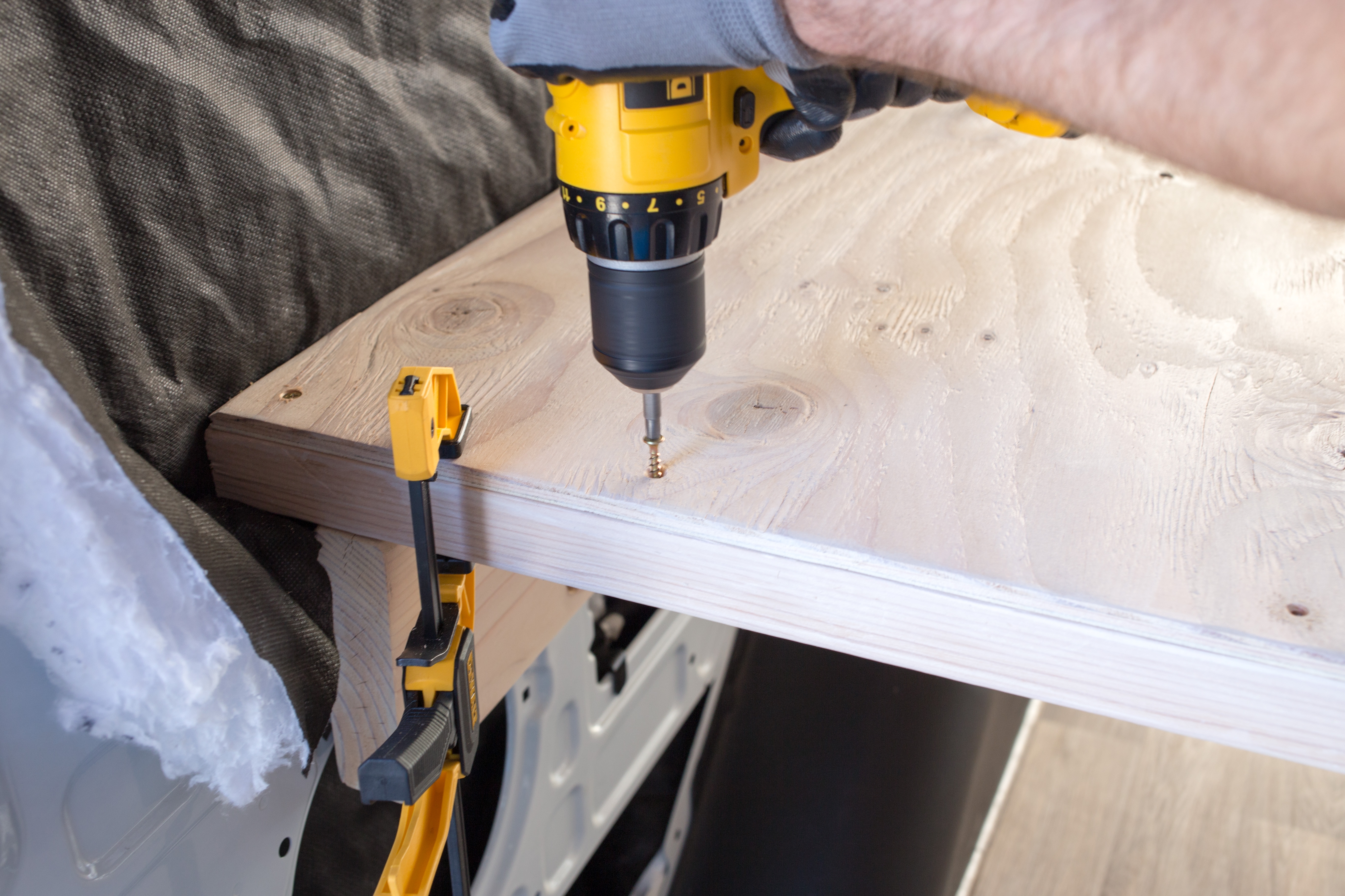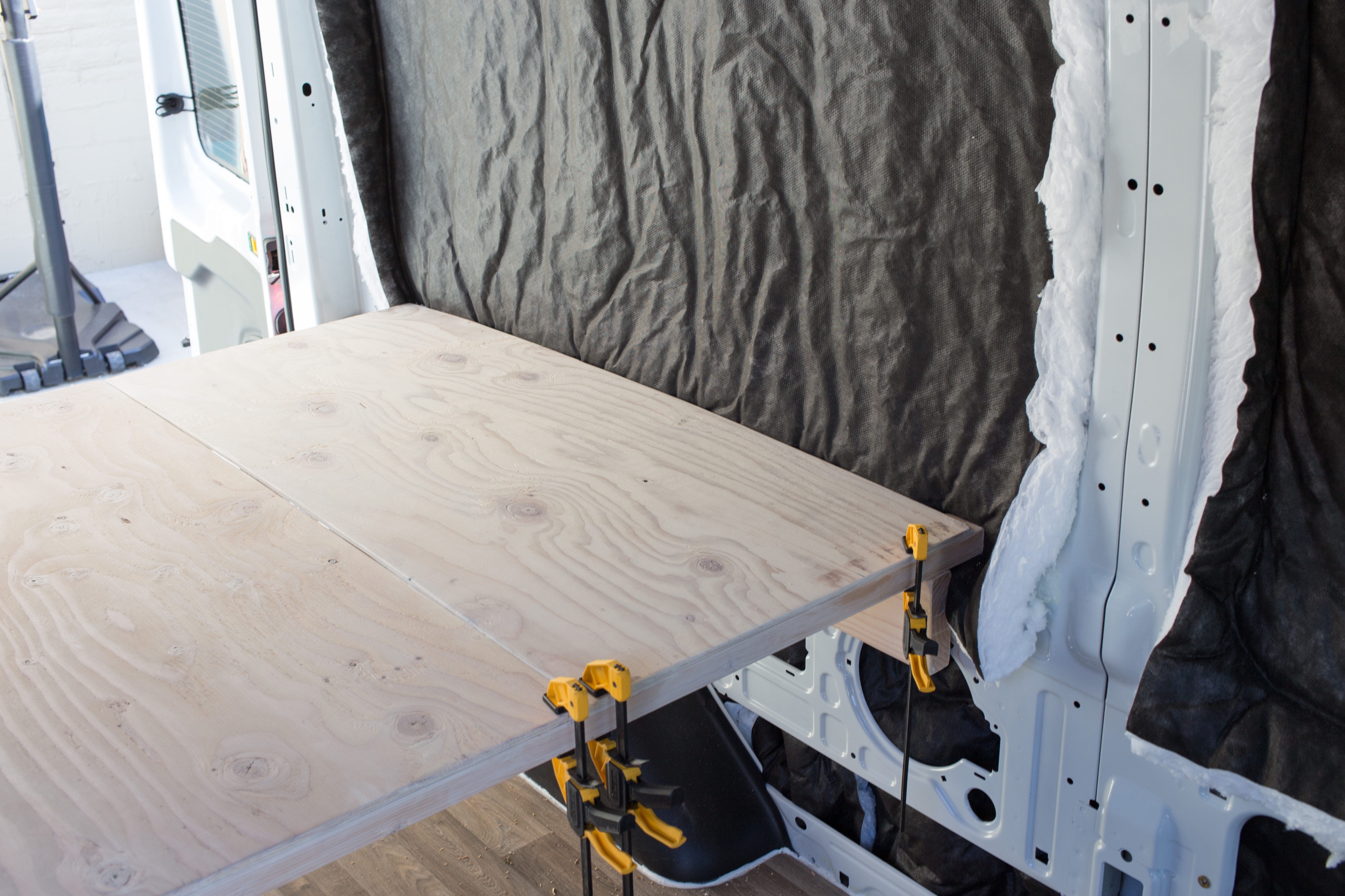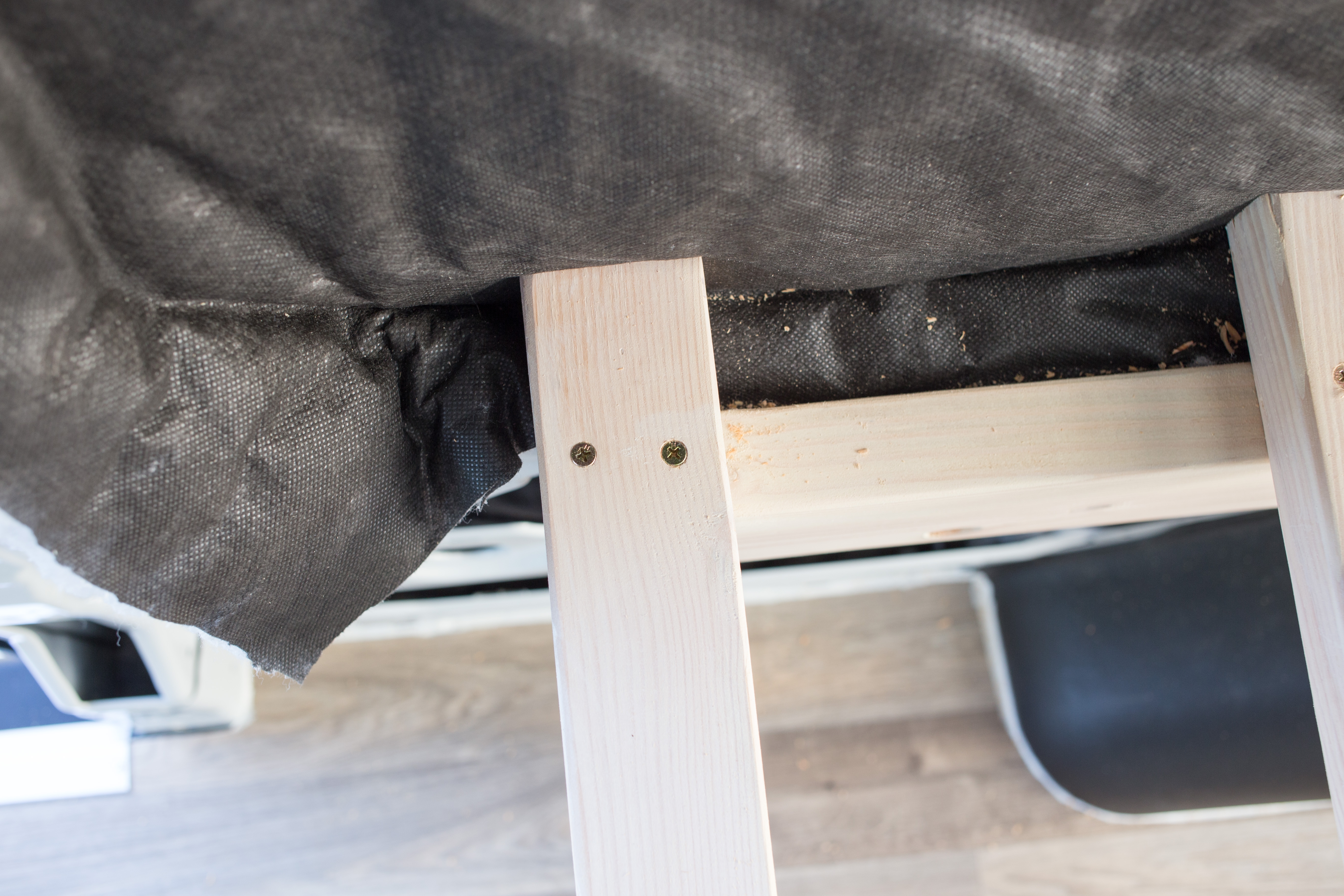 Because van bodies flex while driving we decided to only screw down the passenger side of the 2x3s and let the driver side float.