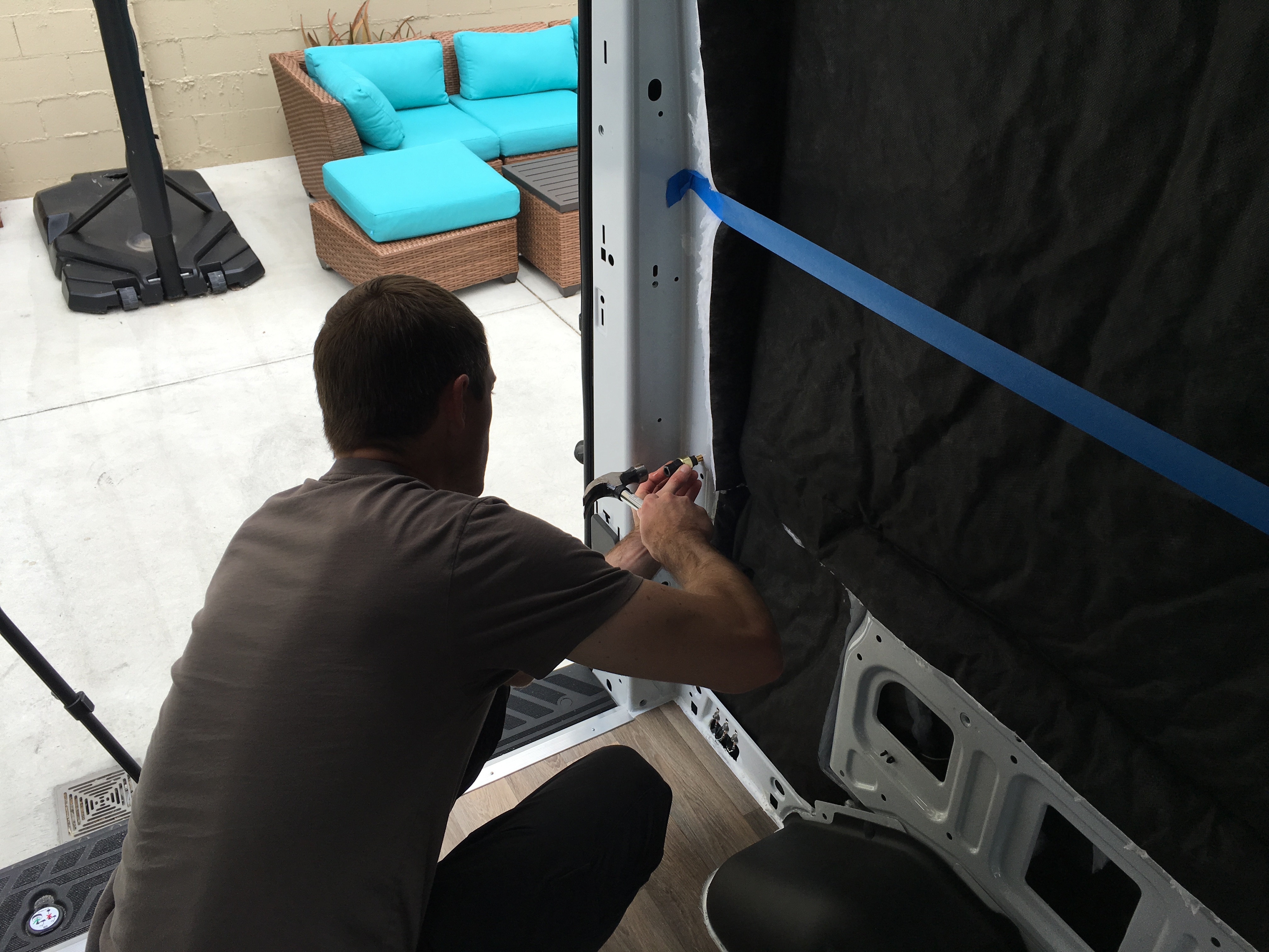 Hello to you two we are also converting a transit to a weekend camper for my wife and I, our project is similar but our van was a 12 passenger diesel van so I have removed all the seats and interior panels to insulate with the 3M thinsulate we bought from Hein (lots of bandaids required) as you have except we have windows so it will be less insulation than your project and harder to cool. I have purchased a very small 4400 BTU heat pump which is used for marine use and will install a heat exchanger in the front to remove heat from the water jacketed condenser. i’ve been experimenting with this unit in the garage running off 4 T-105 batteries and a 1500W inverter and found the fan for the heat exchanger draws as much current as the heat pump alone so I’ll put a pulse width modulator on that fan in order to slow the fan down. We also installed the Maxxair roof fan. Really enjoying your blog!