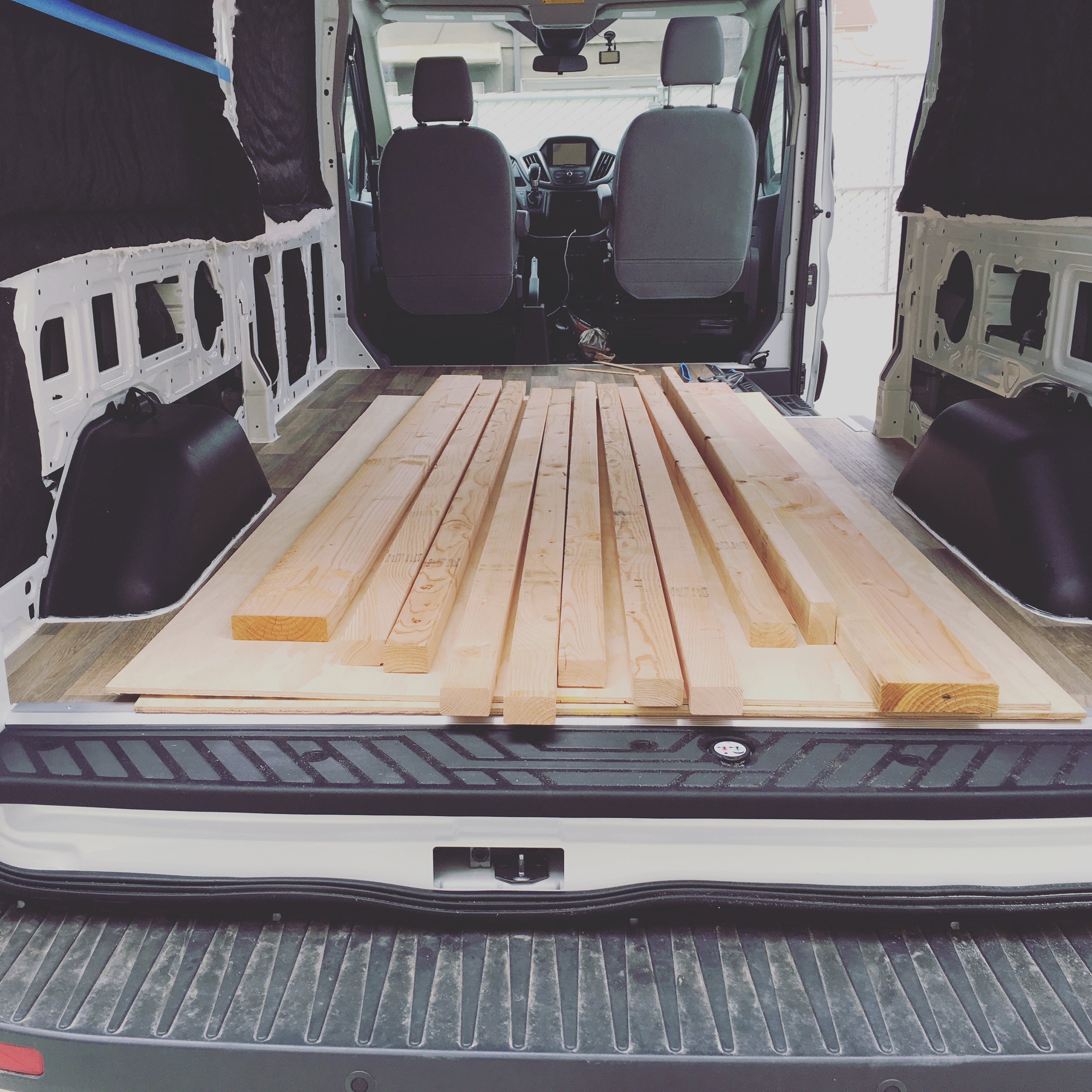 After making a few rough sketches we purchased all the wood we thought we would need. 2×3’s for slats, 2×6’s to mount to the van frame, and some plywood for the top of the platform.